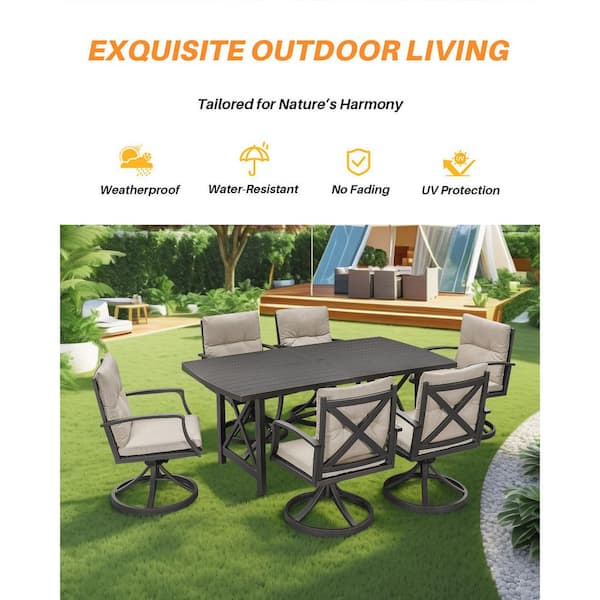 AluLux 7-Piece Dark Brown Aluminum Outdoor Dining Set with 6-Swivel Dining Chairs, Rectangular Table and Beige Cushions