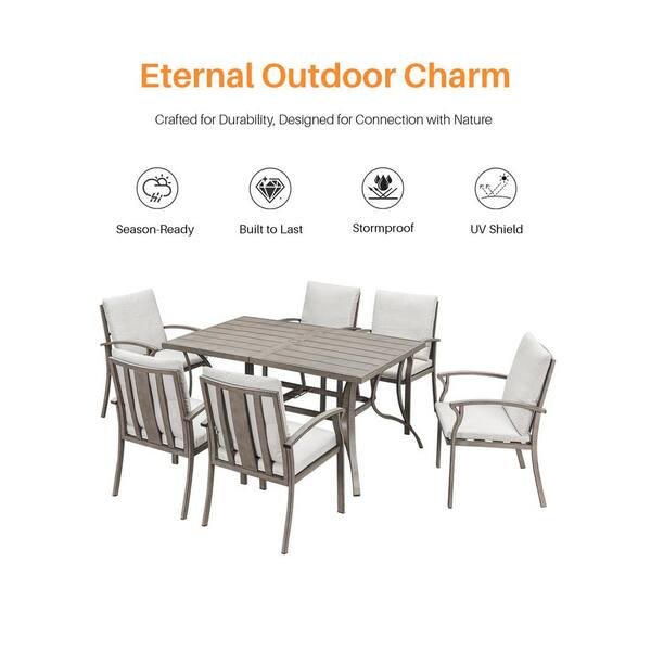 AluLux 7-Piece White Oak Aluminum Outdoor Dining Set with Rectangular Table and Beige Cushions