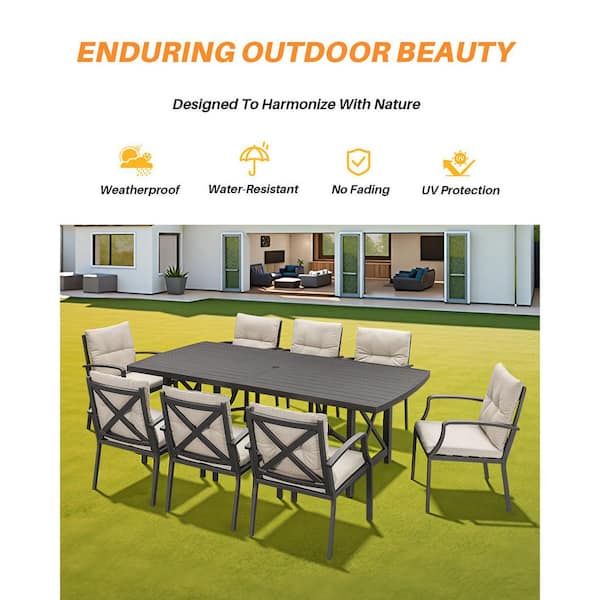 AluLux 9-Piece Dark Brown Aluminum Outdoor Dining Set with Rectangular Table and Beige Cushions