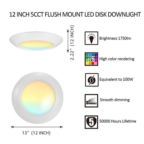 12 in. 90 CRI 2700K to 5000K 5 CCT Selectable LED Disk Light and Dimmable Integrated LED Flush Mount Ceiling Light