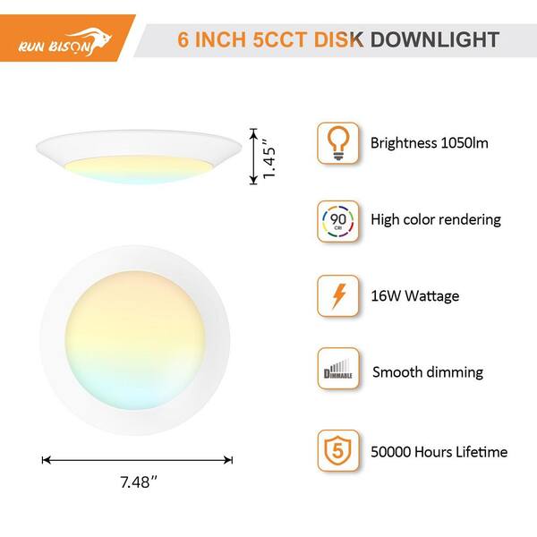6 in. 90 CRI 2700K-5000K 5CCT Selectable LED Dimmable Light, Integrated LED Flush Mount Ceiling Disk Light (2-Pack)