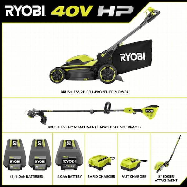 40V HP Brushless 21" Cordless Walk Behind Self-Propelled Mower, String Trimmer & Edger w/ (3) Batteries & (2) Chargers