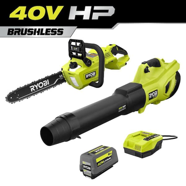 40V HP Brushless Whisper Series 160 MPH 650 CFM Cordless Battery Blower & 14 inch Chainsaw w/ 6.0 Ah Battery & Charger