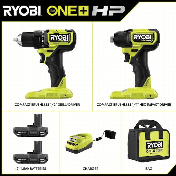 • Includes: Drill, Impact Driver, (2) Batteries, Charger, and Bag