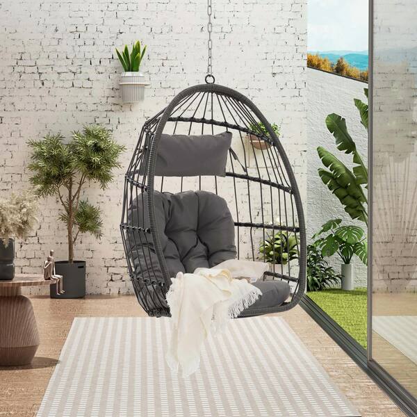 Rattan Porch Swing Outdoor Indoor Garden Rattan Egg Swing Chair Hanging Chair with Light Gray Cushions