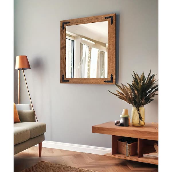 (33 in. W x 34 in. H) Honey Hardwood Rectangle Mirror with Decorative Corner Bracket