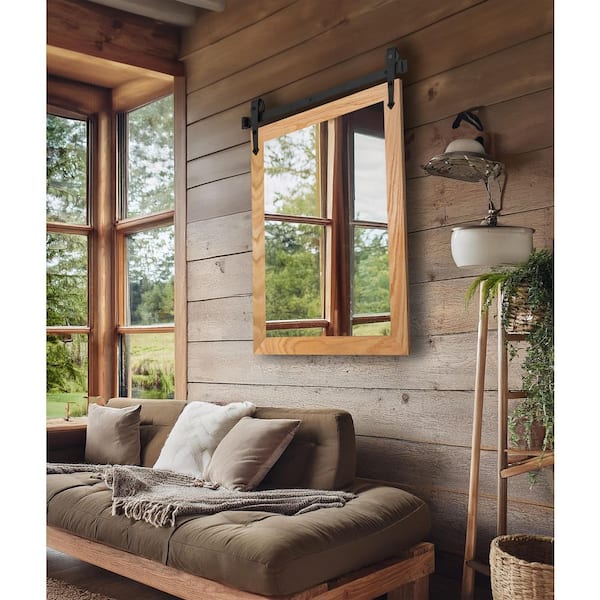 (33 in. W x 44 in. H) Natural Oak Hardwood Mirror With Steel Barndoor Rail