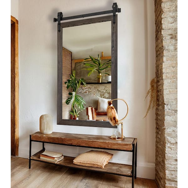 (33 in. W x 54 in. H) Ebony Oak Hardwood Mirror with Steel Barndoor Rail