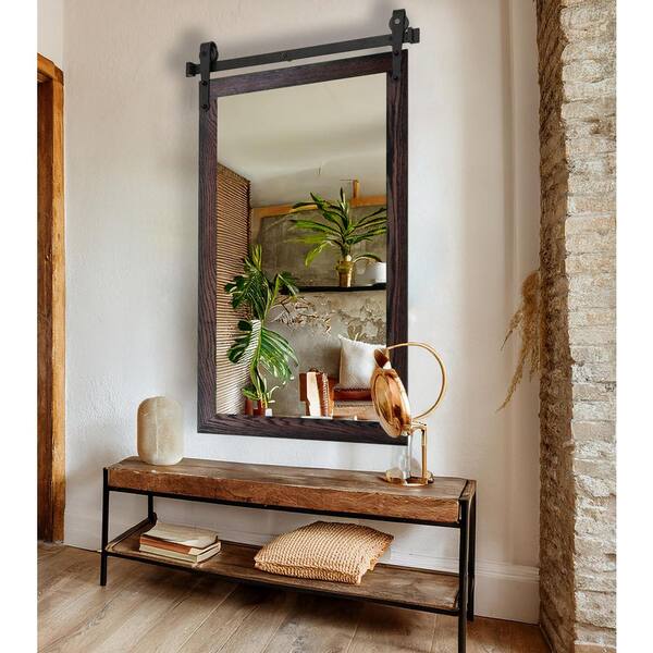 (33 in. W x 58 in. H) Black Cherry Oak Hardwood Mirror With Steel Barndoor Rail