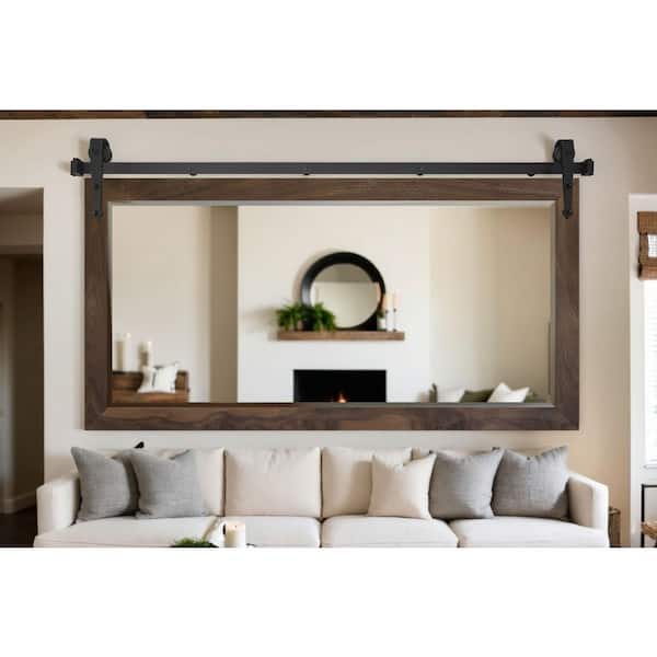 (66 in. W x 32 in. H) Walnut Hardwood Beveled Mirror With Steel Barndoor Rail