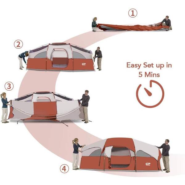 Red 8-Person Camping Tents, Weather Resistant Family Tent, 5 Large Mesh Windows, Double Layer, Divided Curtain