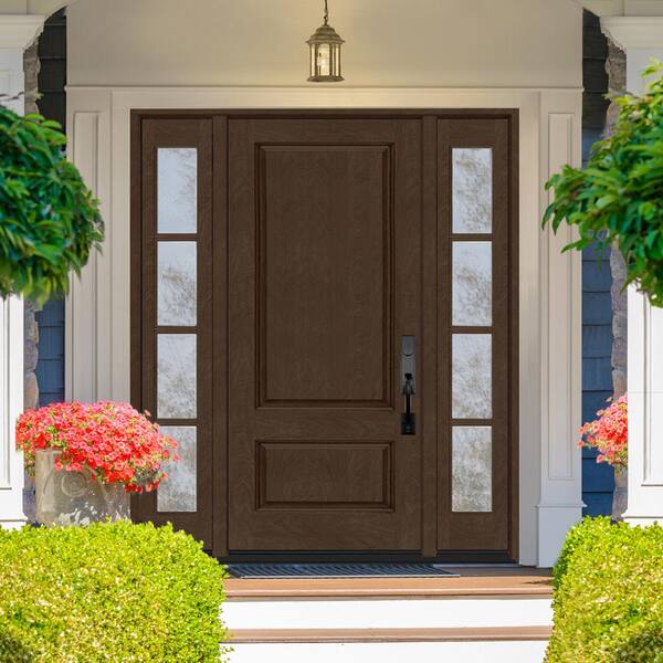• Exterior woodgrain fiberglass door with sidelites resists weather
