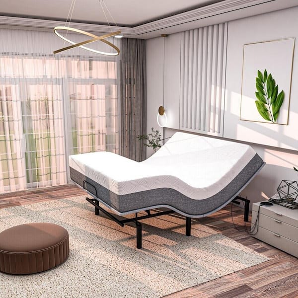 Gray California King Adjustable Bed Frame USB, Massage, Head/Foot Incline, Under Bed Light with 12 in. Hybrid Mattress
