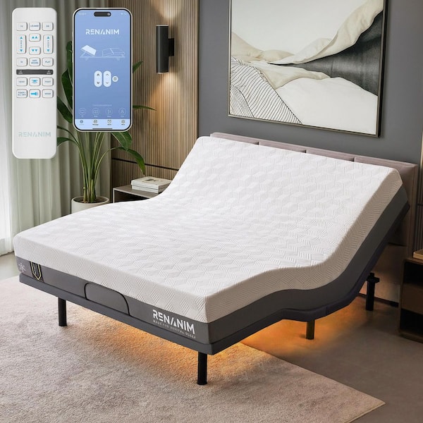 Gray King Adjustable Bed Frame + 10" Cooling Gel Memory Foam Mattress-Massage, USB, Under Bed Light, APP, Remote