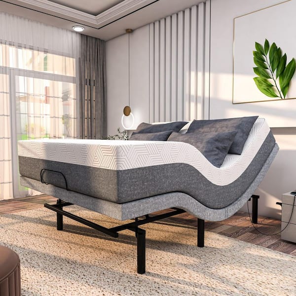 Gray SFE Full Adjustable Bed Frame + Medium-Soft Hybrid Memory Foam Mattress-USB, Under Bed Light, Wireless Remote