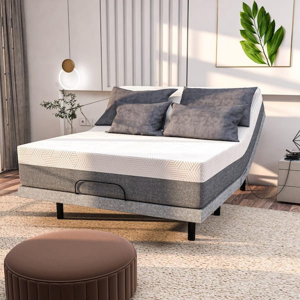 Gray SFE King Adjustable Bed Frame + Firm Hybrid Memory Foam Mattress-USB, Under Bed Light, Wireless Remote, Massage