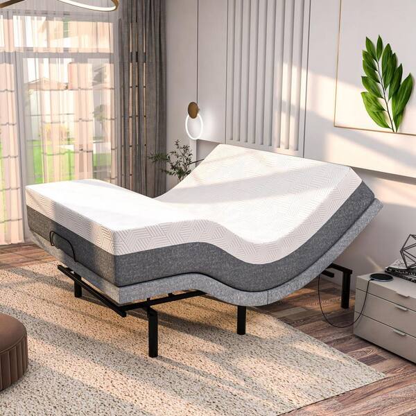 Gray SFE King Adjustable Bed Frame + Medium-Firm Hybrid Memory Foam Mattress-USB, Under Bed Light, Wireless Remote