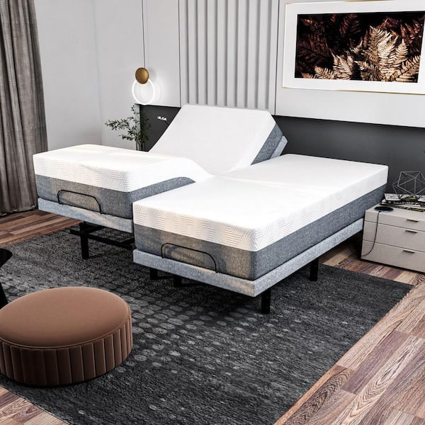 Gray Split-King Adjustable Bed Frame + 10 in. Cooling Gel Memory Foam Mattress-Massage USB, Under Bed Light, APP, Remote