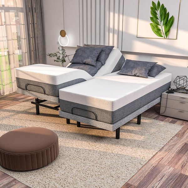 Gray Split-King Adjustable Bed Frame + 10 in. Hybrid Memory Foam Mattress-USB, Under Bed Light, Wireless Remote, Massage