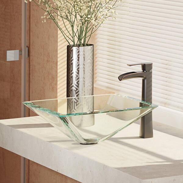 Glass Vessel Sink in Crystal with R9-7007 Faucet and Pop-Up Drain in Antique Bronze