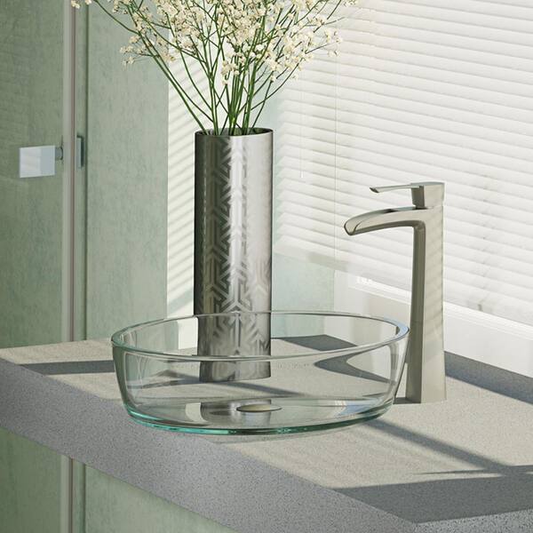 Glass Vessel Sink in Crystal with R9-7007 Faucet and Pop-Up Drain in Brushed Nickel