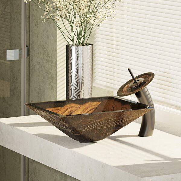Glass Vessel Sink in Metallic Green and Gold with Waterfall Faucet and Pop-Up Drain in Antique Bronze