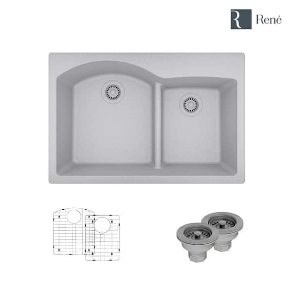 Pewter Granite Quartz 33 in. Double Bowl Drop-In Kitchen Sink Kit