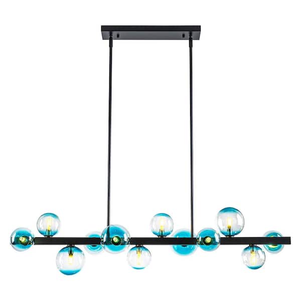 Luna 12-Light Matte Black Mid-Century Modern Kitchen Island Pendant with Gradient Blue Glass Globes
