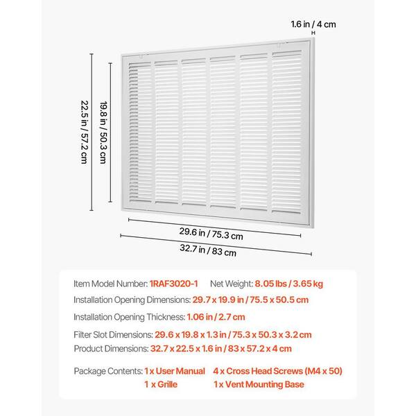 Return Air Filter Grille, Fits 30 W x 20 in. H Duct Opening, Filter Not Included, Return Air Vent Cover for Wall