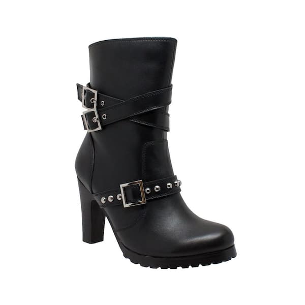 Women's Size 8 Black Oiled Grain Leather 10 in.Three Buckle Motorcycle Boots