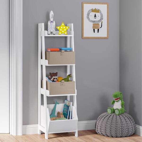 13 in. Wide White Ladder Shelf Toy Organizer and Book Storage with 3-Open Shelves with Two 5 in. H Taupe Fabric Bins