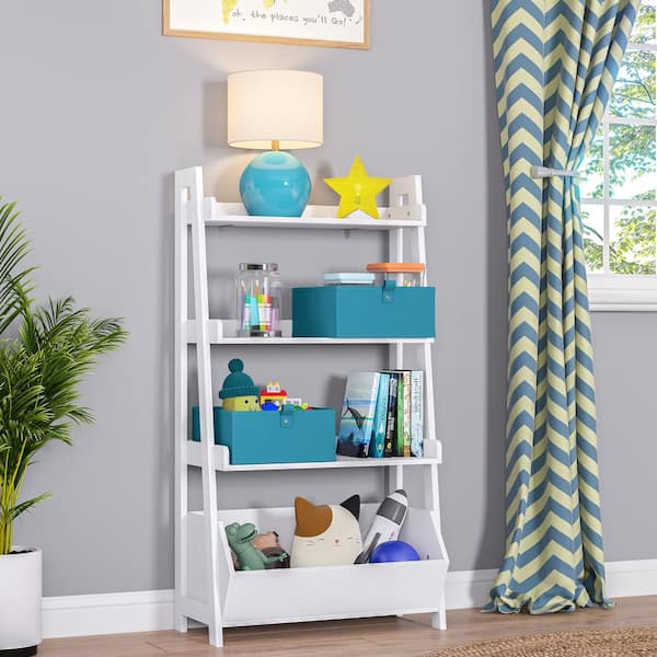 24 in. Wide White Ladder Shelf Toy Organizer and Book Storage with 3-Open Shelves with Two 5 in. H Turquoise Fabric Bins