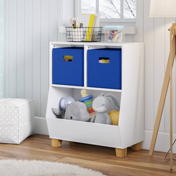 29.1 in. H x 23.6-in. W x 13.31 in. D White MDF Catch-All Toy Organizer with 2-Cubbies, 2-Compartments and 2-Blue Bins