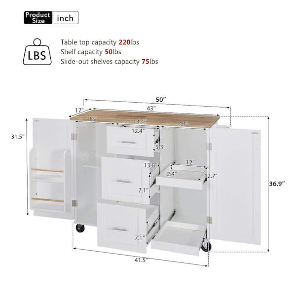 Rolling White Kitchen Cart with Rubber Wood Top, 3-Drawer, 2 Slide-Out Shelf and Internal Storage Rack