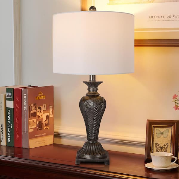 20 in. Bronze Resin Table Lamp With White Linen Shade No Assembly Required, 1 Pack Living Room Lighting Table Lamp