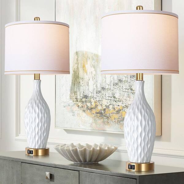 27 in. White Table Lamp with USB Ports, Set of 2, 3-Way Dimmable Touch Control lamp with Linen Shade (LED Bulb Included)