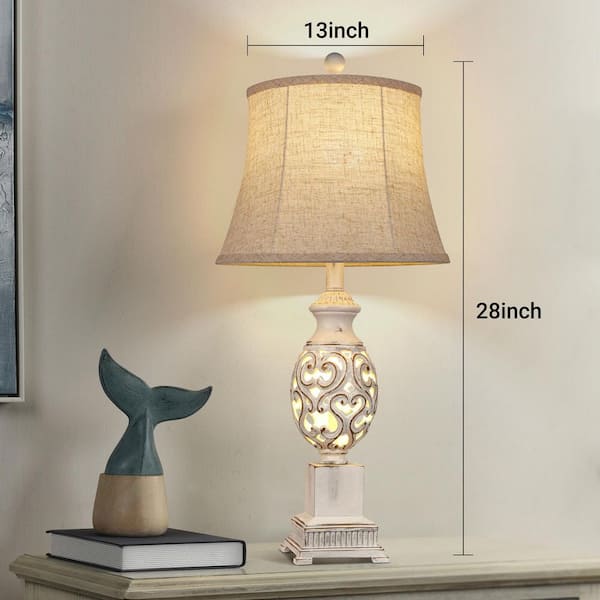 28 in. Distressed White Tall Bedside Lamp with Night Light Rustic Table Lamps with Linen Shade for Living Room End Table