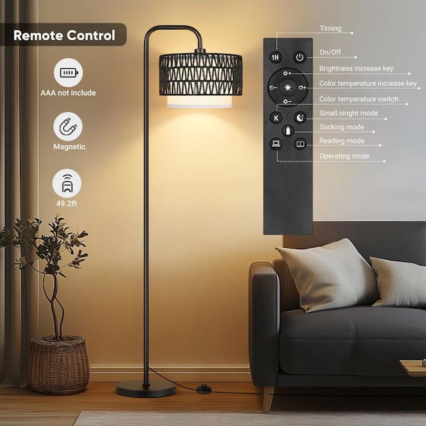 68 in. Black Paint Boho Standing Lamp, 1-Bulb Remote 3-Color Temp Arc Floor Lamp for Bedroom with Rattan Fabric Shades