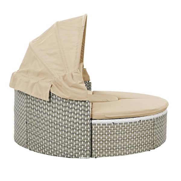 Round Gray Wicker Outdoor Sectional Set and Day Bed with Light Coffe Cushion and Canopy