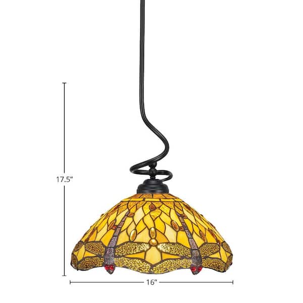 Royale 100-Watt 1-Light Matte Black Shaded Pendant Light with 16 in. Amber Dragonfly Art Glass Shade, No Bulb Included