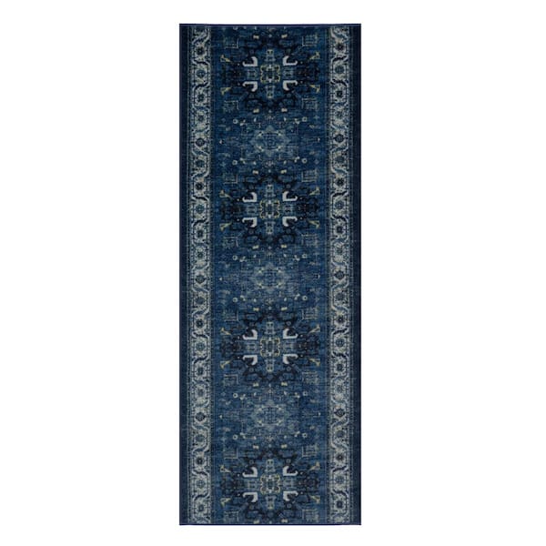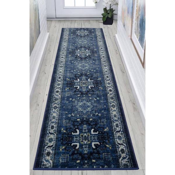 Antique Collection Series Medallion Navy Blue 35 in. x 29 ft. Your Choice Length Stair Runner