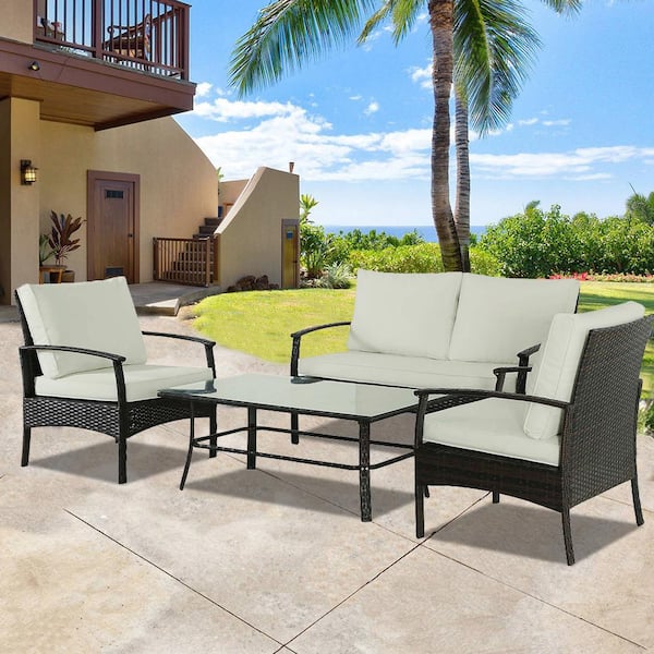 4-Piece Wicker Outdoor Sectional Set Patio Conversation Sofa Set with Beige Cushions