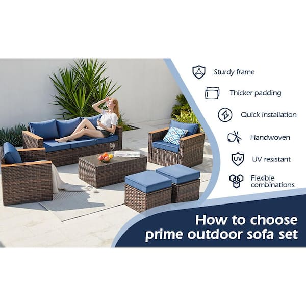 6 Piece Wicker Outdoor Dining Set with Blue Cushion Exclusive Quick Install Patio Sectional Sofa Conversation Sets