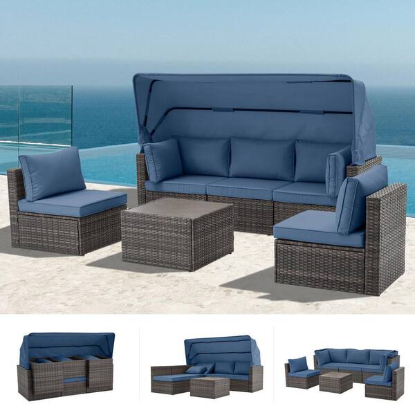 6-Piece Wicker Outdoor Sectional Sofa Set Patio Conversation Set with Blue Cushions Adjustable Canopy Backrest