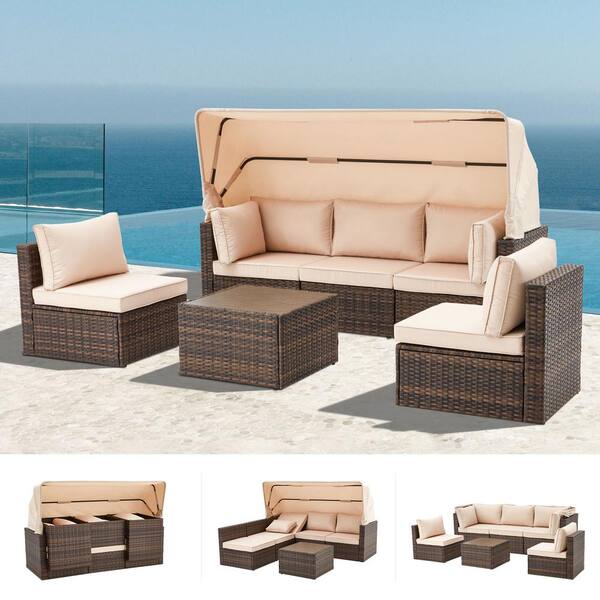 6-Piece Wicker Outdoor Sectional Sofa Set Patio Conversation Set with Khaik Cushions Adjustable Canopy Backrest