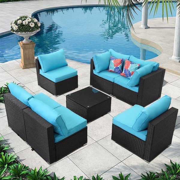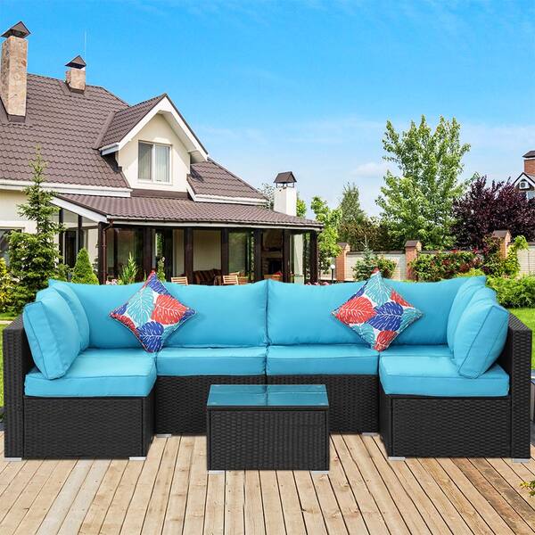 7-Piece Wicker Outdoor Sectional Set Patio Conversation Sofa Set with Blue Cushions