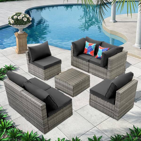 7-Piece Wicker Outdoor Sectional Set Patio Conversation Sofa Set with Gray Cushions
