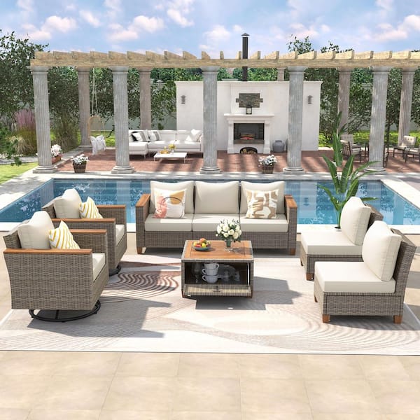 8-Piece Wicker Outdoor Patio Swivel Rocking Chairs Sectional Sofa Set with Beige Thick Cushion and Acacia Storage Table