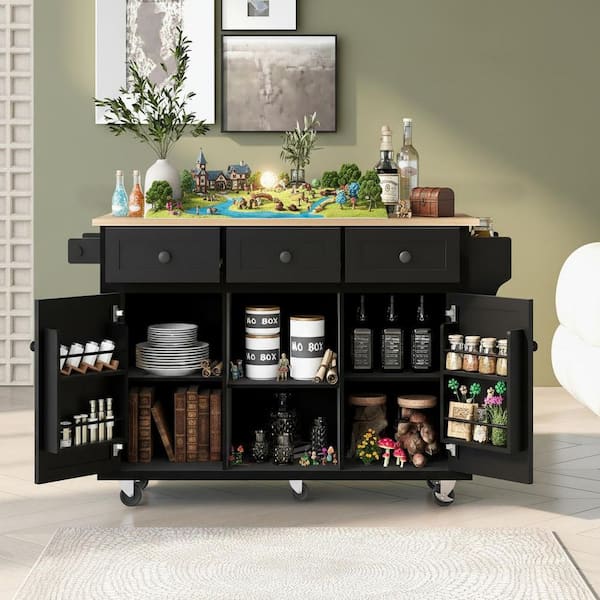 Black Rubberwood Drop-Leaf Countertop 53.1 in. Kitchen Island Cart with Cabinet Door Internal Storage Racks and 3-Drawer