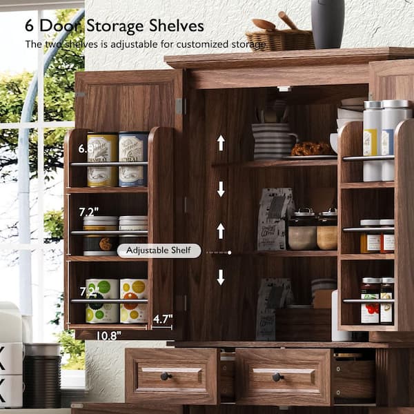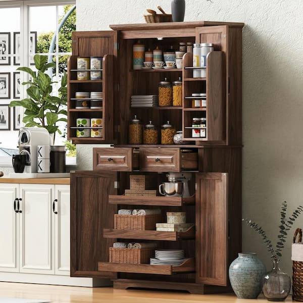 Farmhouse Brown Wood 31.5 in. Embossed Texture Kitchen Island Tall Kitchen Pantry Cabinet with 4-Door and 2-Drawer